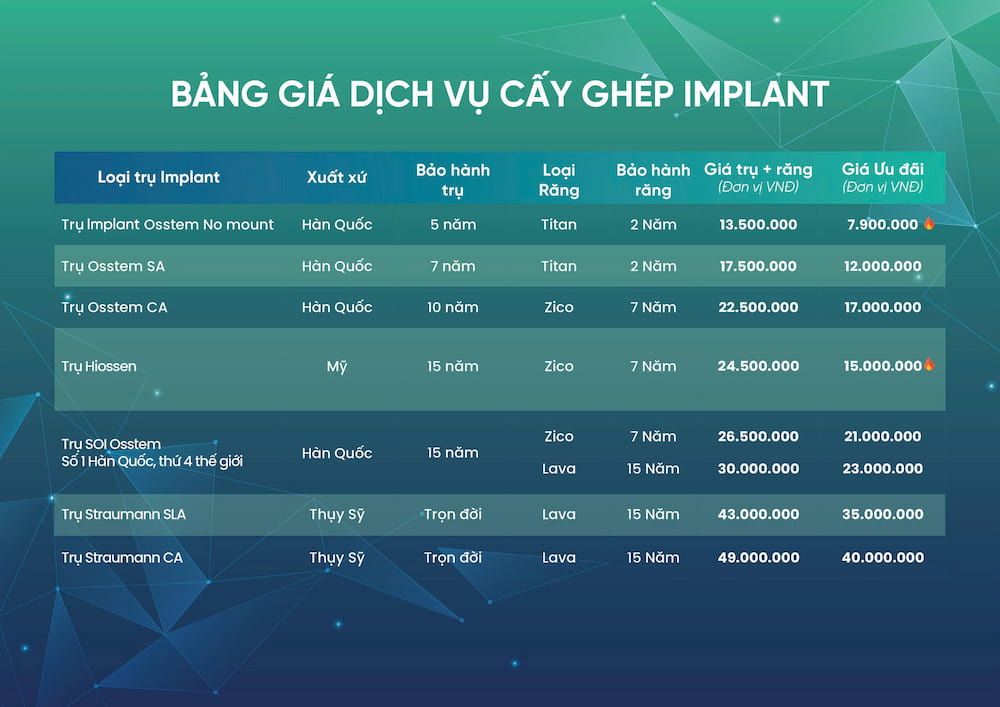 Bảg giá trên bao gồm trọn gói: 1 trụ và 1 răng sứ phục hình. Chưa bao gồm chi phí ghép xương, nâng xoang (nếu có chỉ định).