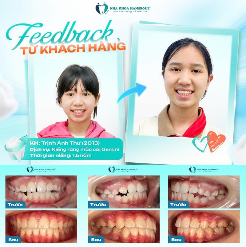 Bé Anh Thư trước và sau niềng răng mắc cài cố định tại Bệnh viện RHM Việt Anh Đức - Nha khoa Hanseoul.
