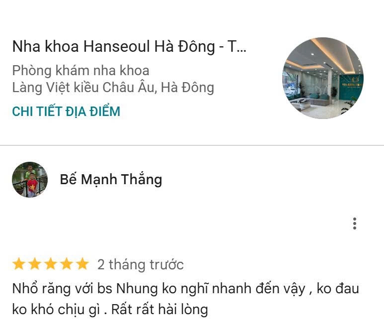 Trên nền tảng đánh giá Google Maps, anh Bế Mạnh Thắng đã không ngần ngại chia sẻ: “Nhổ răng với bác sĩ Nhung không nghĩ nhanh đến vậy, không đau không khó chịu gì. Rất rất hài lòng!”