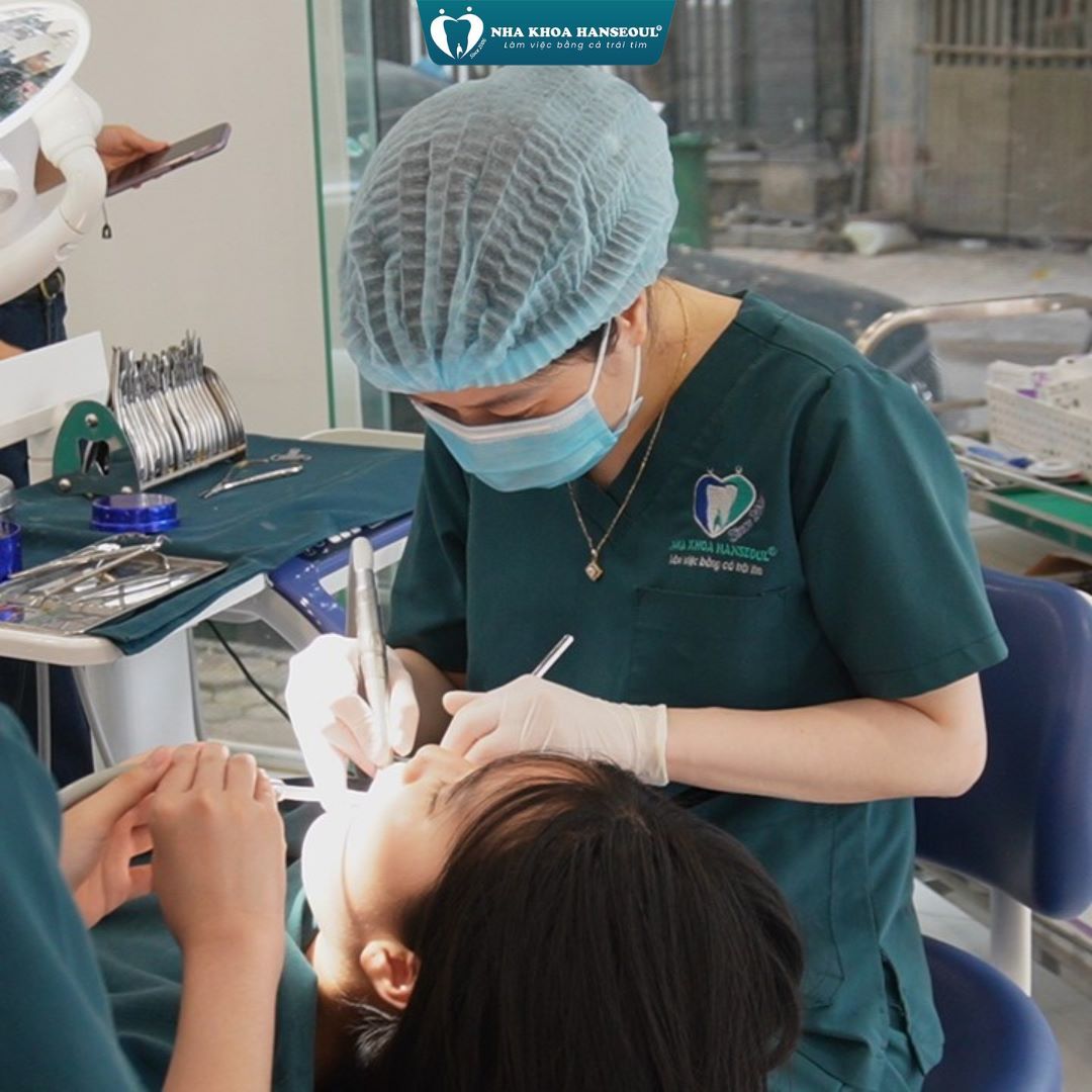 Bác sĩ làm sạch răng, điều trị sâu – viêm nướu (nếu có) trước khi gắn mắc cài hoặc attachment. Mọi thao tác đều tuân thủ quy trình vô khuẩn.