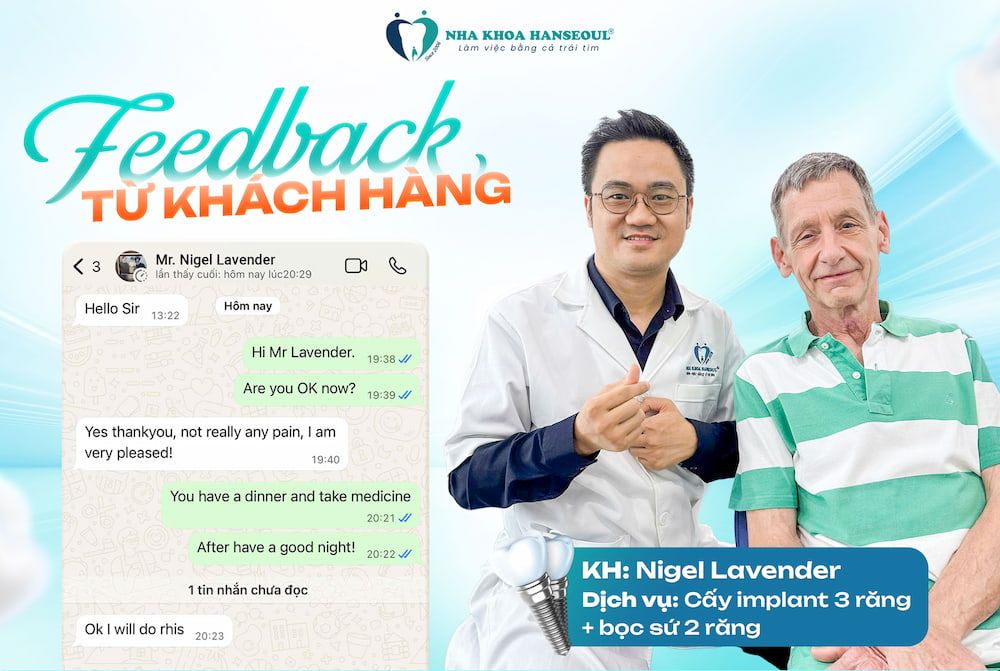 Phản hồi tích cực này không chỉ là niềm vui cho đội ngũ y bác sĩ mà còn là minh chứng rõ ràng nhất cho quy trình điều trị chuyên nghiệp, kỹ thuật cao và sự tận tâm của Nha khoa Hanseoul. Sự hài lòng của ông Nigel còn thể hiện ở việc ông đã giới thiệu nhiều người bạn quốc tế khác đến với Nha khoa Hanseoul.