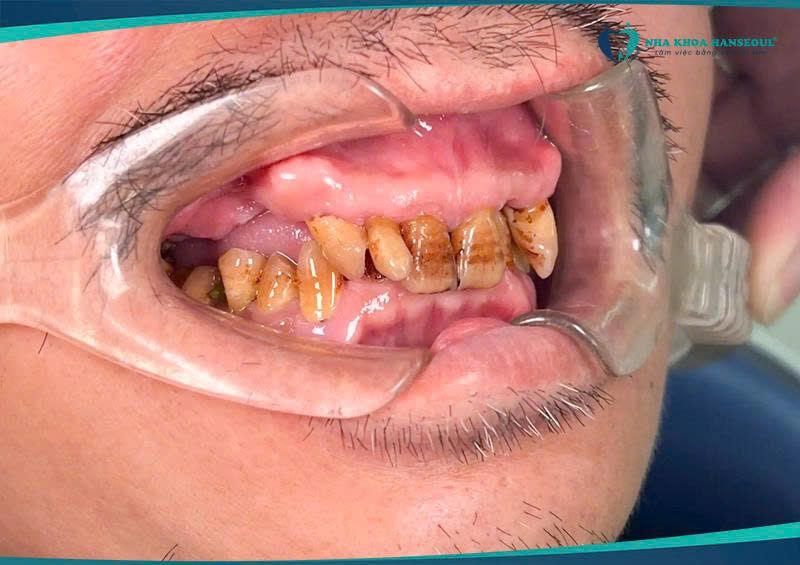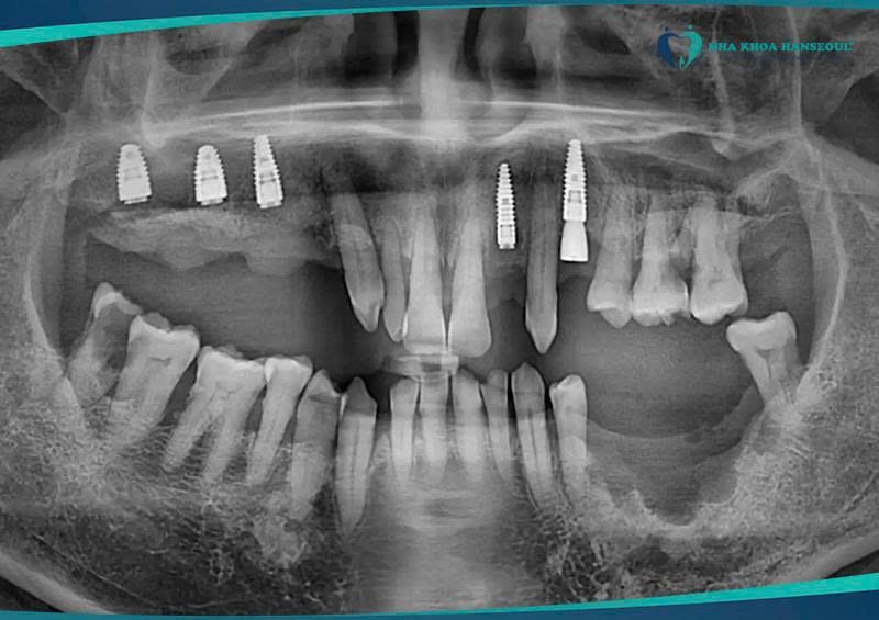 Đến khi thấy việc ăn uống ảnh hưởng quá nhiều đến sinh hoạt hằng ngày, chú quyết định tìm đến Nha khoa Hanseoul để kiểm tra và tư vấn bác sĩ. Kết quả thăm khám cho thấy xương ở một số vị trí đã tiêu nhiều do mất răng lâu, đặc biệt ba răng hàm trên (14 – 16 – 17) cần ghép bột xương và đặt màng xương để tái tạo nền vững. Phác đồ điều trị được thạc sĩ, bác sĩ Trần Việt Hà đưa ra gồm: cấy 5 trụ implant và phục hình 6 răng (bắc cầu răng 36 trên trụ răng 35 và 37) — kế hoạch rõ ràng, bài bản và phù hợp nhất để chú có thể ăn uống bình thường trở lại.