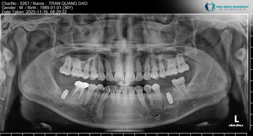 Hai vị trí răng 36 và 47 của anh Đạo được cấy Implant Hiossen (Mỹ) – dòng implant được đánh giá cao về độ ổn định và khả năng tích hợp xương. Theo bác sĩ Trần Việt Hà, Implant Hiossen phù hợp với những ca răng hàm chịu lực nhai lớn nhờ:
