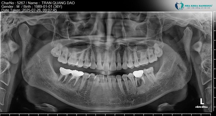 “Lúc mới làm xong thì tôi thấy ăn nhai vẫn ổn, không đau nên cũng yên tâm,” anh Đạo kể lại. Tuy nhiên, sau một thời gian, vùng răng này bắt đầu xuất hiện ổ áp xe lớn, kèm theo cảm giác đau nhức và sưng, răng bị lung lay gây ảnh hưởng tới ăn uống và sinh hoạt. Khi đến thăm khám tại Hanseoul và chụp phim CT Cone Beam, Thạc sĩ, Bác sĩ Trần Việt Hà xác định tình trạng nhiễm trùng kéo dài đã khiến xương hàm quanh chân răng bị tiêu nghiêm trọng.
