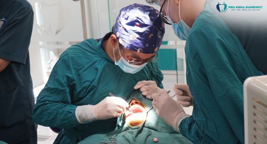 Với hai răng 36 và 47, bác sĩ tiến hành nhổ răng kết hợp nạo sạch ổ áp xe, làm sạch mô viêm và kiểm soát nhiễm trùng bằng kháng sinh phù hợp. Đây là bước quan trọng nhằm loại bỏ hoàn toàn vi khuẩn trước khi tiến hành cấy implant, giúp hạn chế tối đa nguy cơ biến chứng về sau.