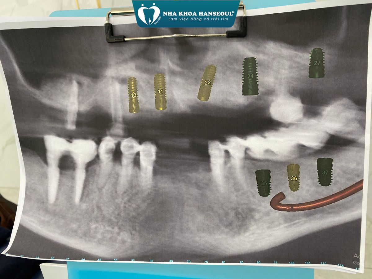 - Hàm dưới: Đặt thêm Implant Hiossen (Mỹ) để phục hình lại các răng mất, đảm bảo khả năng chịu lực tốt, tích hợp xương nhanh và tuổi thọ lâu dài.